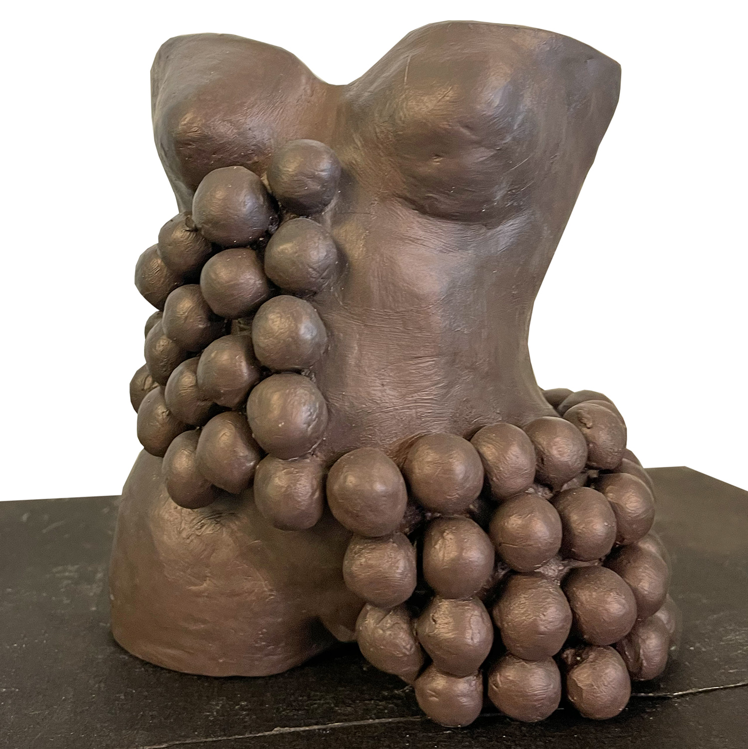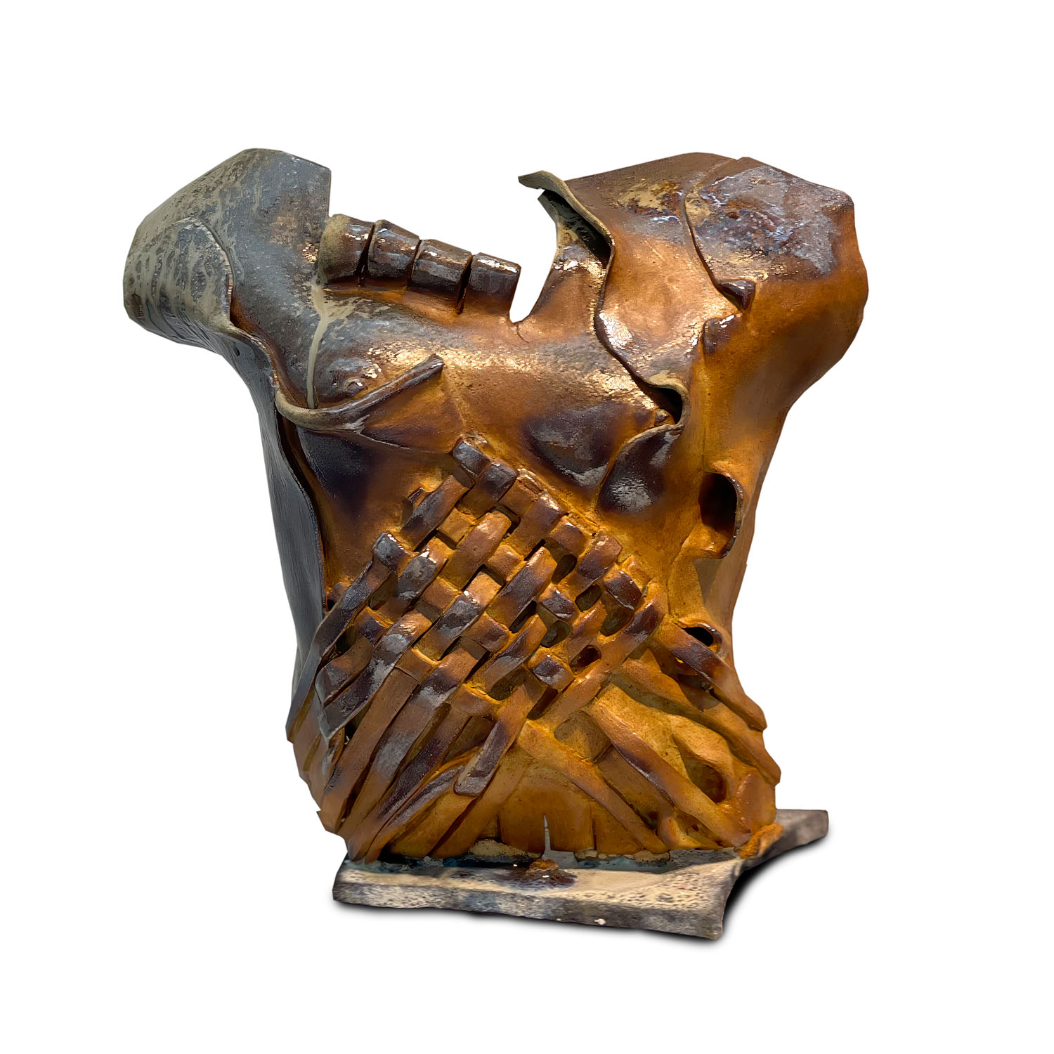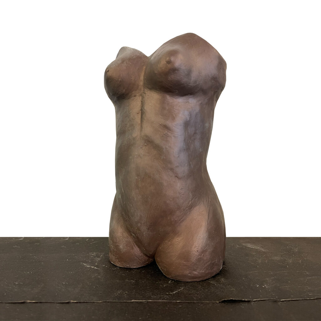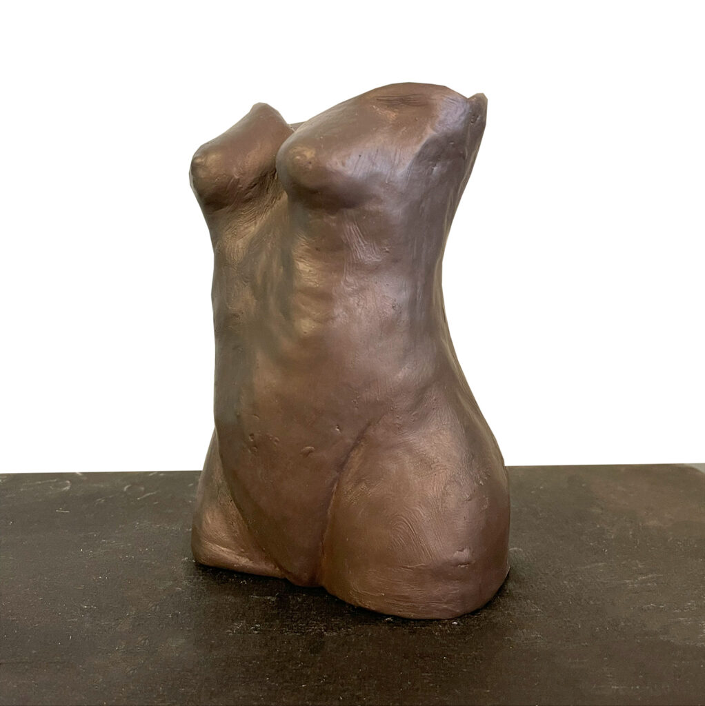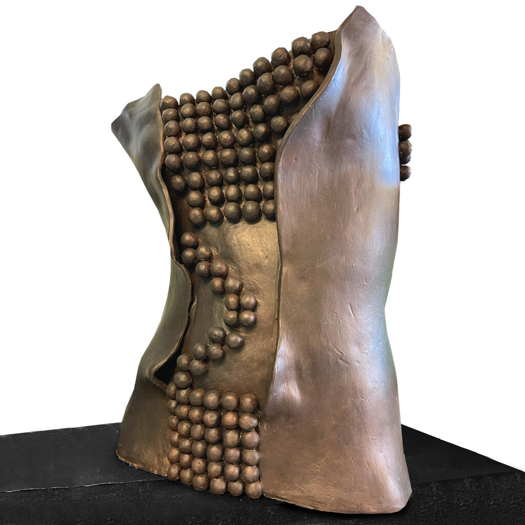 Mandy Henson’s sculptural Armour Series champions bodily autonomy by presenting the female form as both empowered and shielded. Each sculpture, whether life-sized – or smaller – reflects an intricate relationship between body and adornment, where the patterns and embellishments seem less like external clothing and more like extensions of the skin itself. These adornments, akin to a dressmaker’s imagined designs, merge with the body in a way that reflects the seamless intersection between identity and self-expression. The surfaces of the torsos, finished with copper, bronze, or deep brown patinas ( or with wood-fired glazes that create an abalone shell-like effect ) reinforce this fusion of organic form and creative design.