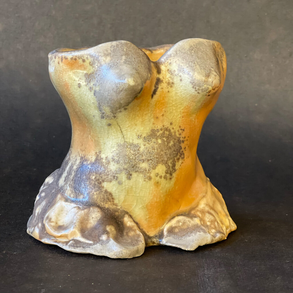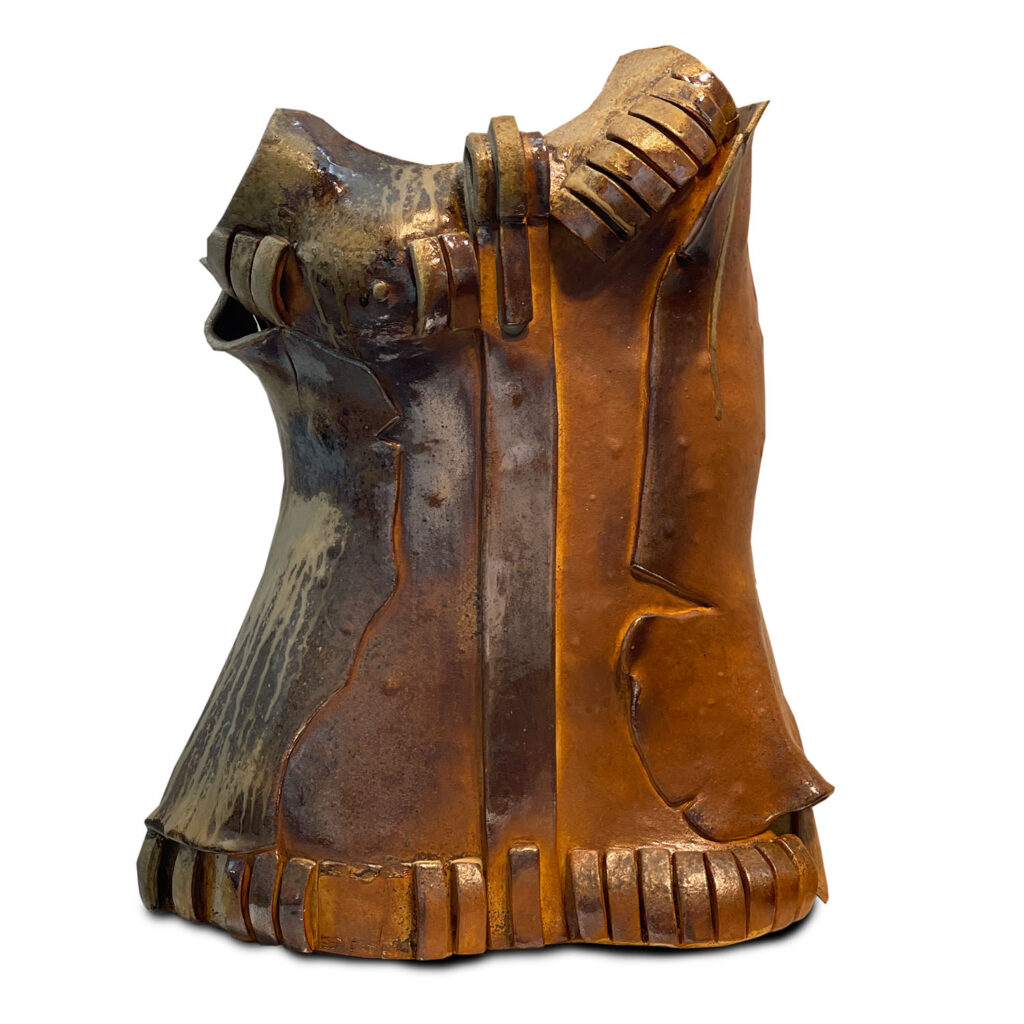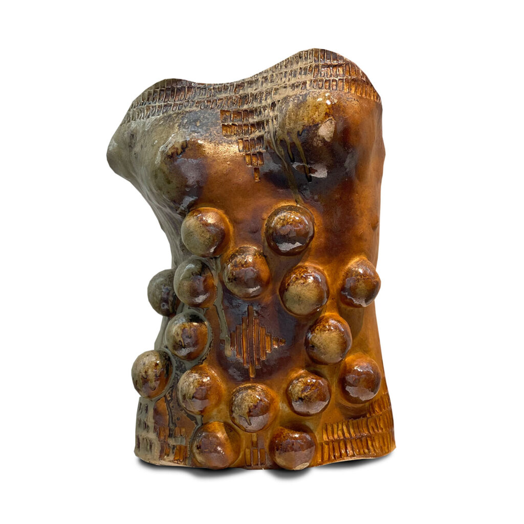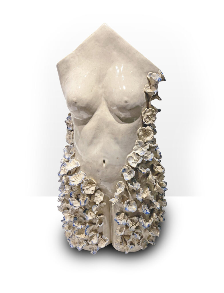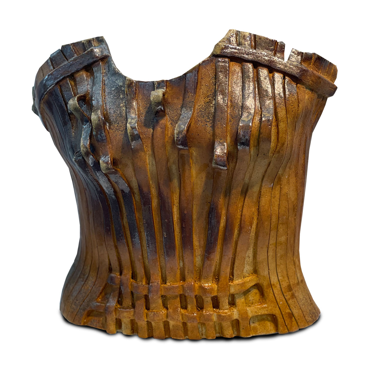 Mandy Henson’s sculptural Armour Series champions bodily autonomy by presenting the female form as both empowered and shielded. Each sculpture, whether life-sized – or smaller – reflects an intricate relationship between body and adornment, where the patterns and embellishments seem less like external clothing and more like extensions of the skin itself. These adornments, akin to a dressmaker’s imagined designs, merge with the body in a way that reflects the seamless intersection between identity and self-expression. The surfaces of the torsos, finished with copper, bronze, or deep brown patinas ( or with wood-fired glazes that create an abalone shell-like effect ) reinforce this fusion of organic form and creative design.