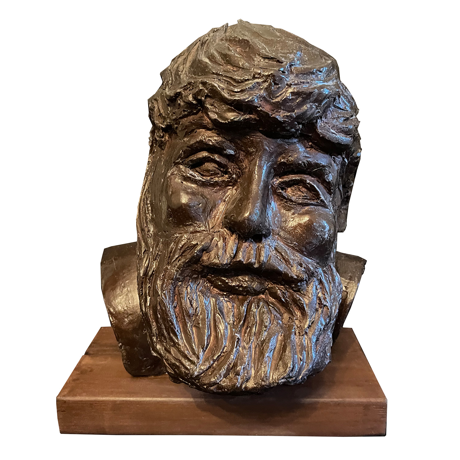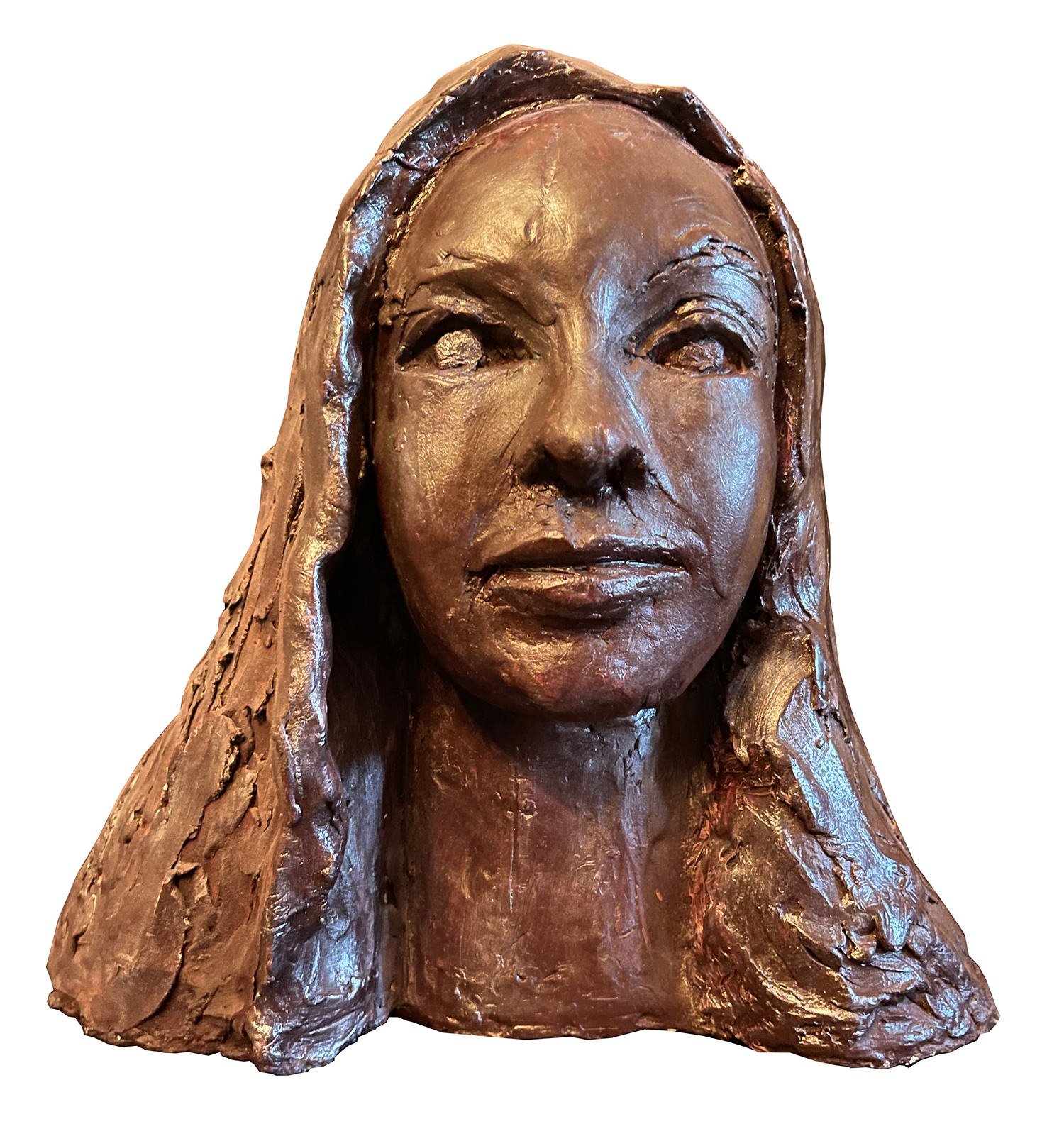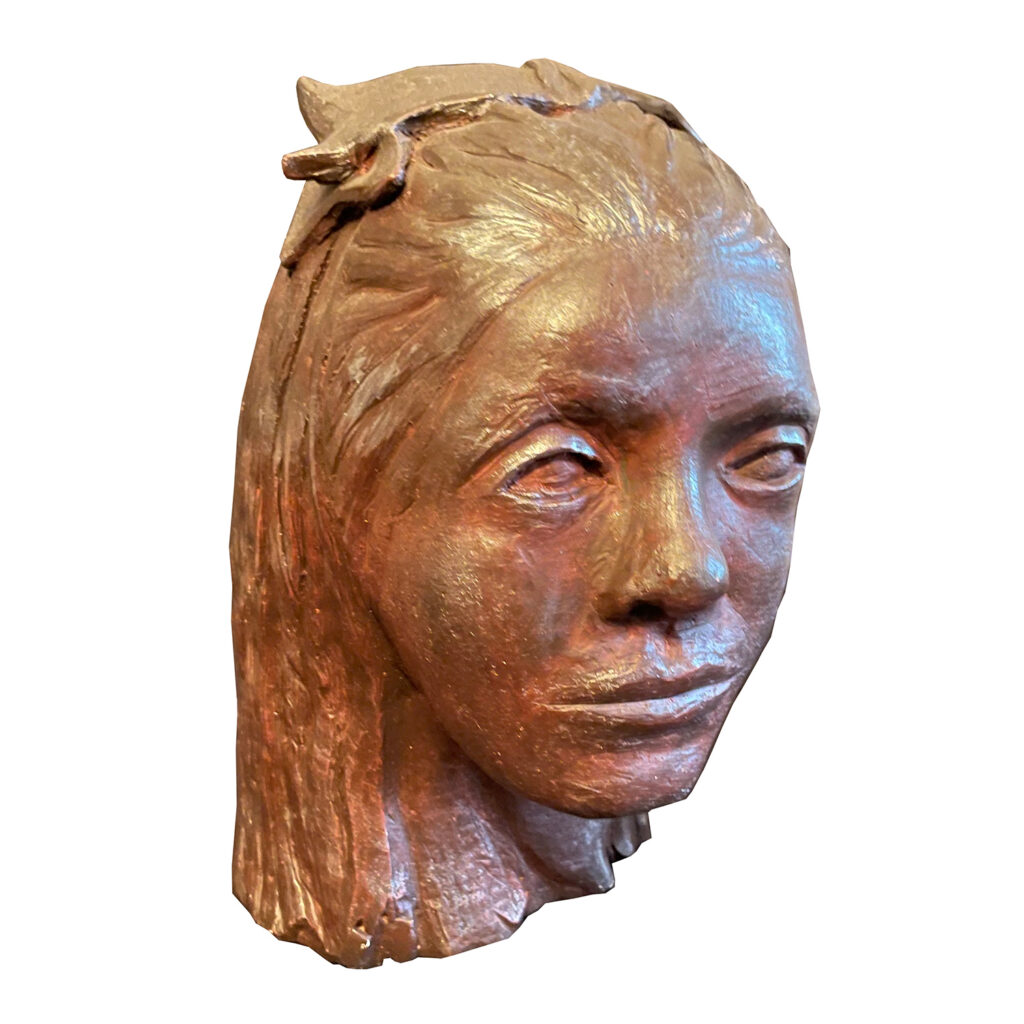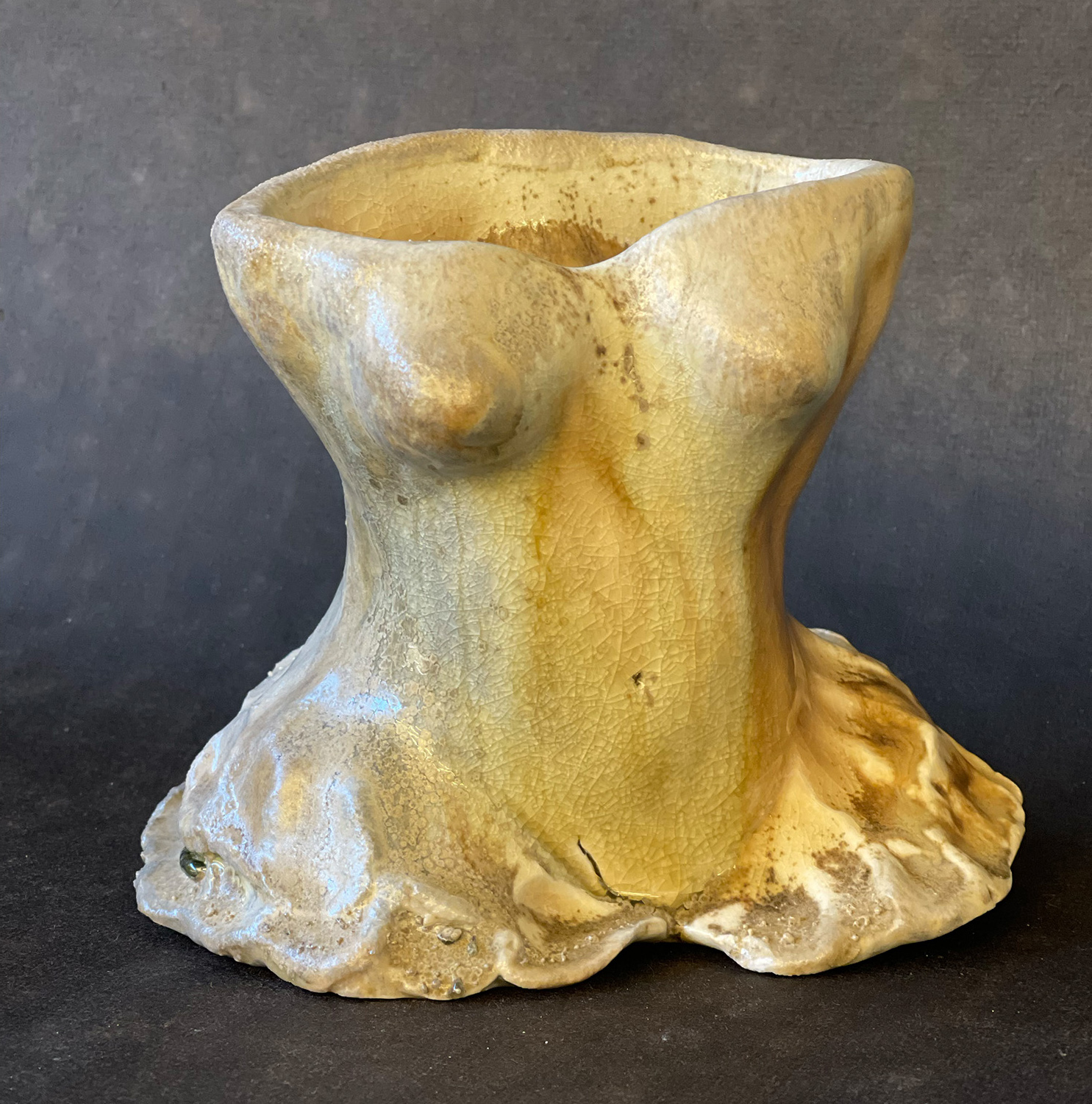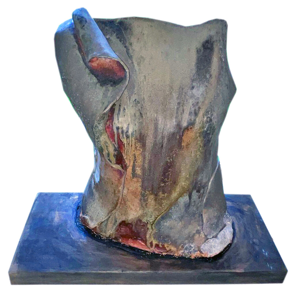 Mandy Henson’s sculptural Armour Series champions bodily autonomy by presenting the female form as both empowered and shielded. Each sculpture, whether life-sized – or smaller – reflects an intricate relationship between body and adornment, where the patterns and embellishments seem less like external clothing and more like extensions of the skin itself. These adornments, akin to a dressmaker’s imagined designs, merge with the body in a way that reflects the seamless intersection between identity and self-expression. The surfaces of the torsos, finished with copper, bronze, or deep brown patinas ( or with wood-fired glazes that create an abalone shell-like effect ) reinforce this fusion of organic form and creative design.