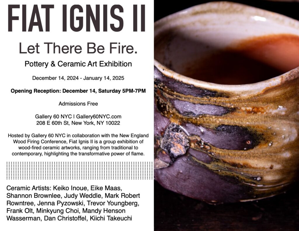 Hosted by Gallery 60 NYC in collaboration with the New England Wood Firing Conference, Fiat Ignis Il is a group exhibition of wood-fired ceramic artworks, ranging from traditional to contemporary, highlighting the transformative power of flame.